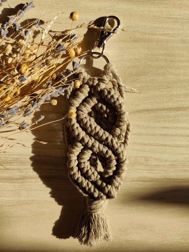 Porte-clés en macramé, de couleur beige, en forme "serpent" avec mousqueton.